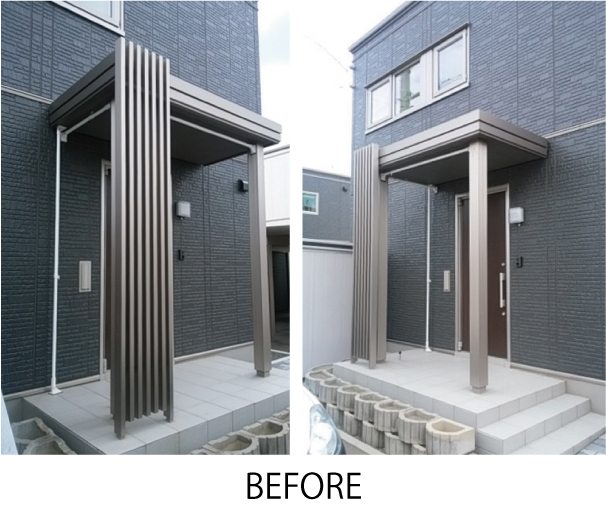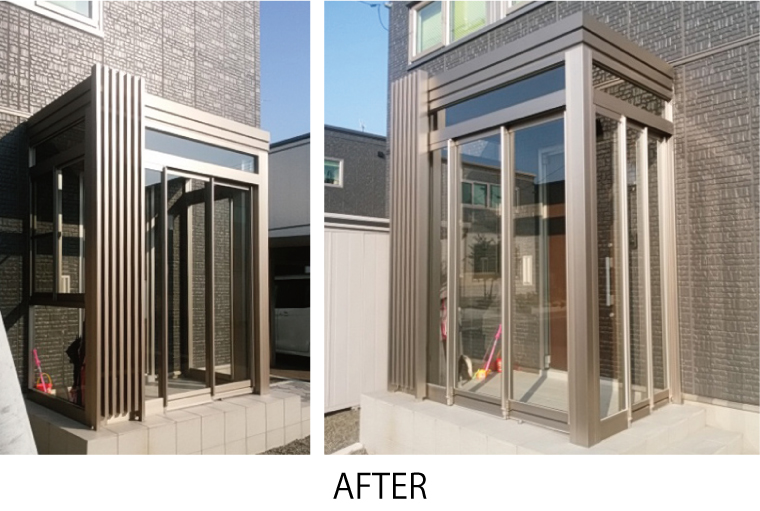 今回後付けで施工したリクシルの風除室(玄関フード) “ツインガード袖付2枚引” は、狭小開口でも広く開口をとれることで非常に人気です。