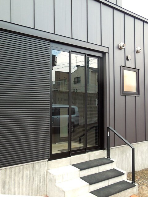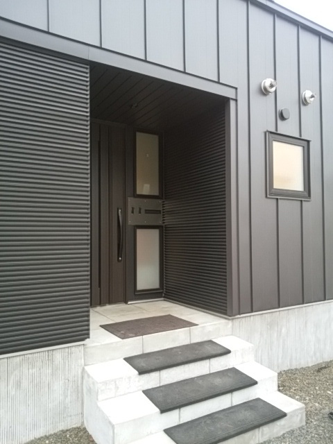 黒い金属板の外壁に溶け込んだような玄関フード。