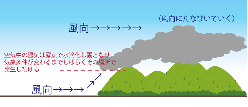 湿気の高い平地の空気が風の力で気温の低い山にどんどん供給され、そのエリアに集中して雲が発生し続け、山向こうに流れていき風向きにより手前には来ない。