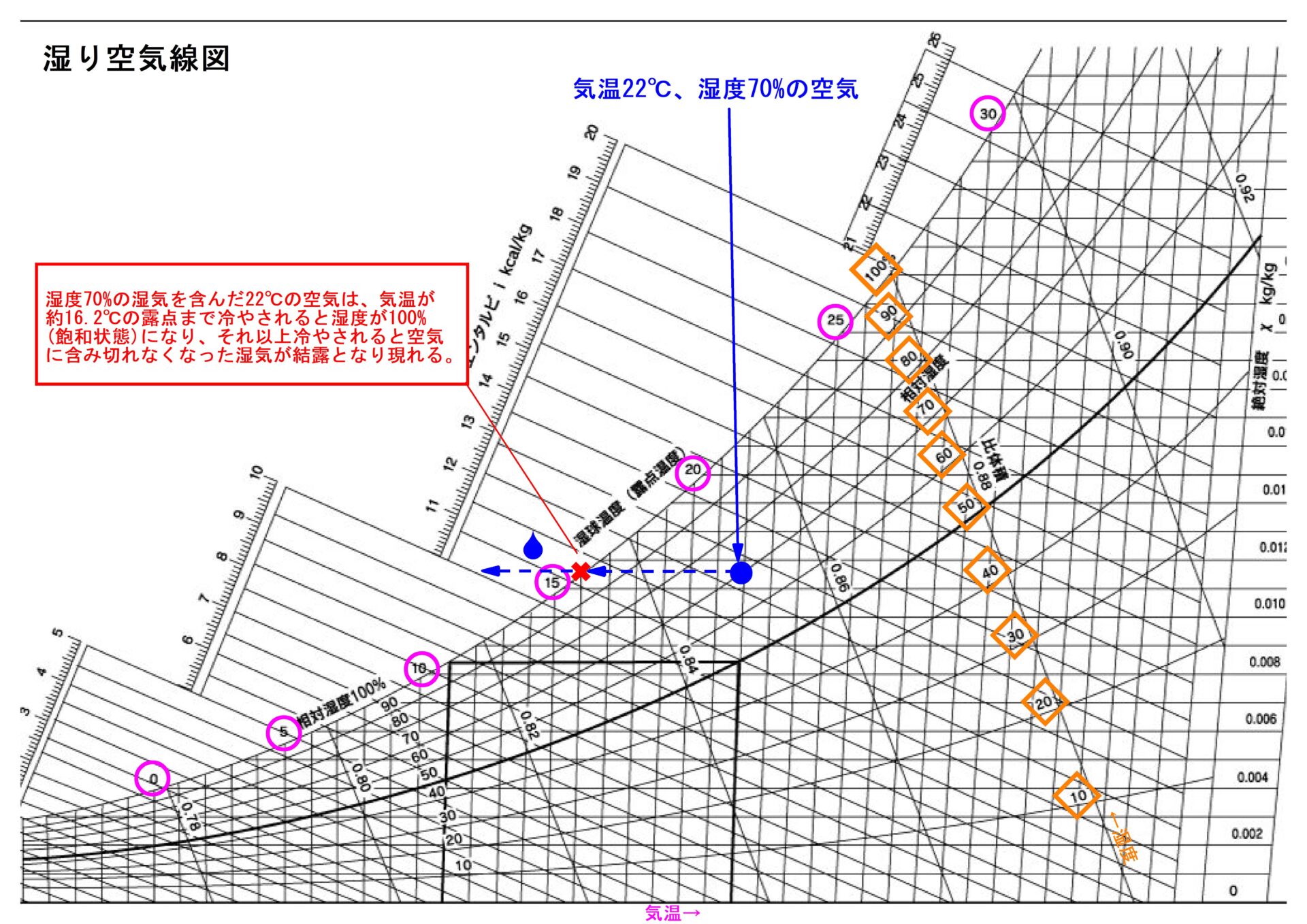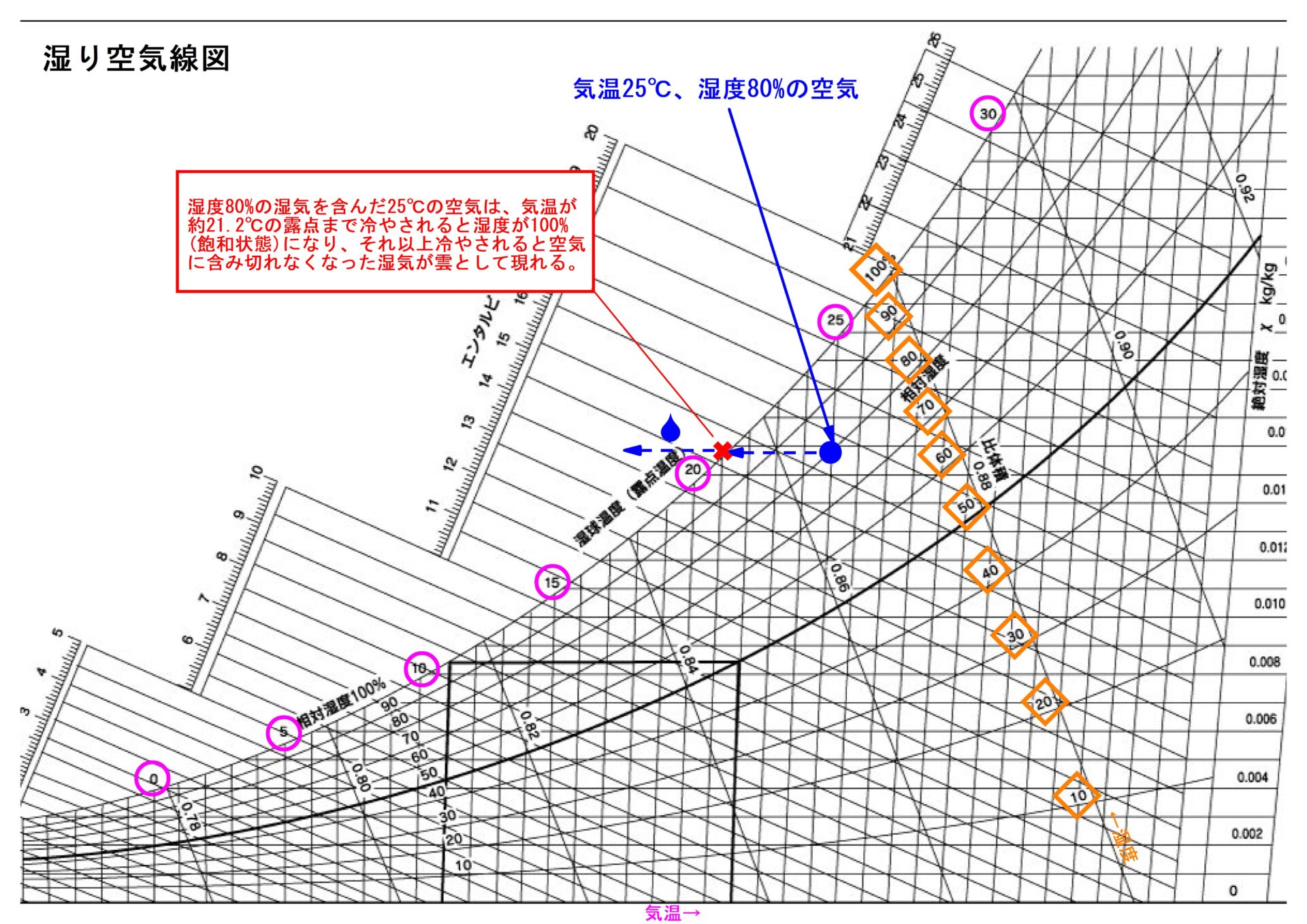 例えば、『気温25℃湿度80%の空気は、約21.2℃以下に冷やされると水滴化する』という現象がこの図に表されています。