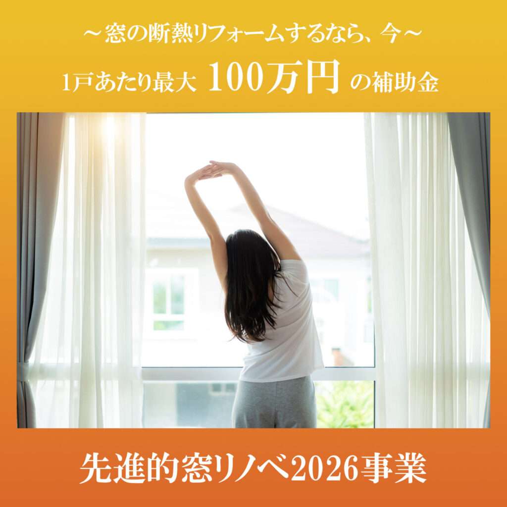 先進的窓リノベ2026事業は、住宅および非住宅建築物(※)開口部の断熱改修が対象となる補助事業で、1戸あたり最大100万円の補助金が受け取れます。